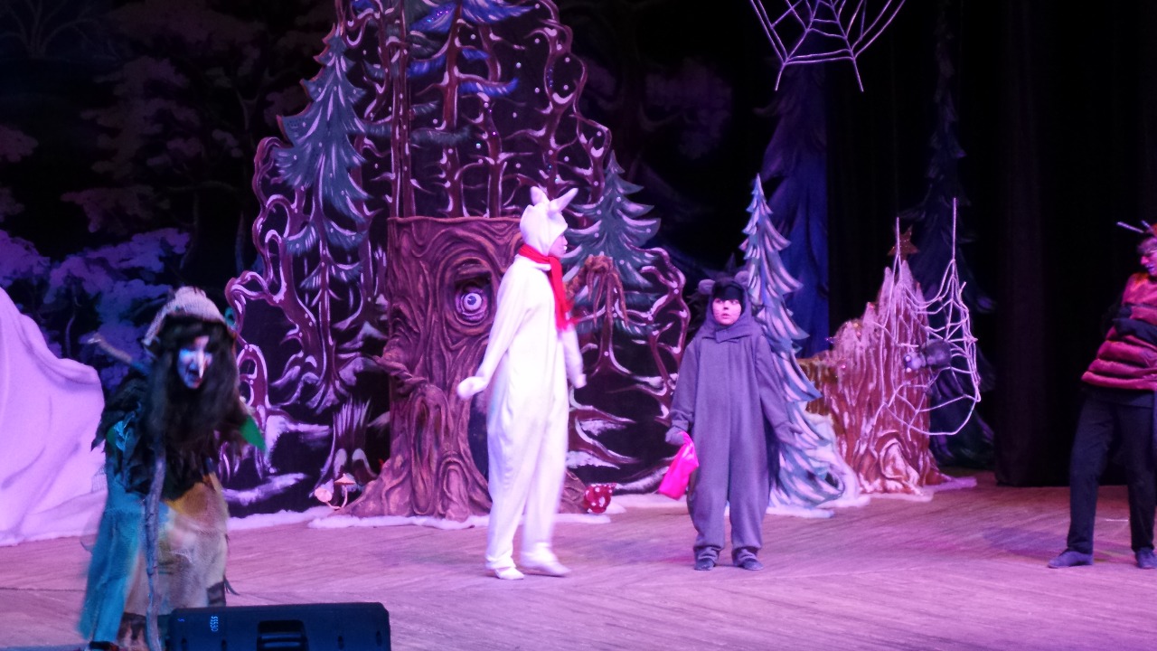 Мы немного опоздали на спектакль, потому что долго ждали автобус. Когда мы приехали нас сразу пригласили в зал на театральное представление "Была у Елочки мечта". Очень понравились актеры, которые много пели и танцевали.